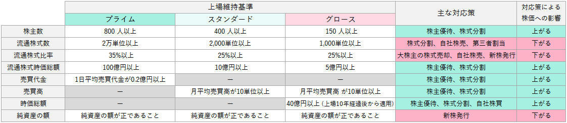 下図の通り、各市場区分ごと項目ごと上場維持基準が設定されており、特に何の項目で上場維持基準に適合していないかが重要です。何の項目かによって実施する対応策はおおよそ予想でき、株価が上がるか下がるか予想できます。